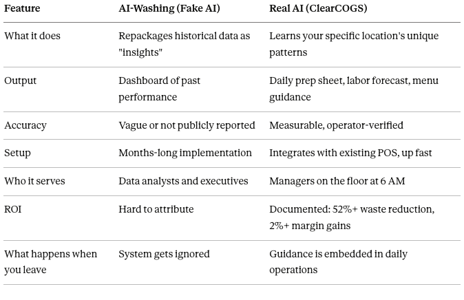 - AI-washing is real and widespread. Most “AI-powered” restaurant tools are rebranded legacy products.
